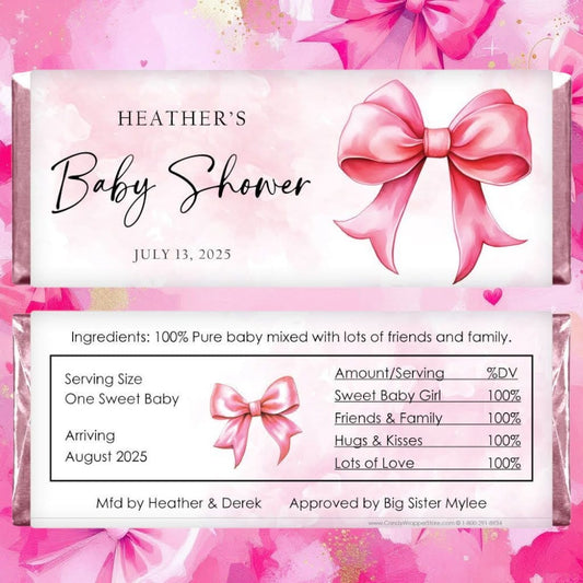 Personalized baby shower Hershey's chocolate candy bar wrappers. Custom party favors can match your theme or colors of your baby shower. Hershey's candy bar wrappers make every baby shower that much sweeter! Unique party favors will leave a lasting impression on your guests and ensure they remember the special day you celebrated the welcoming of your new baby.