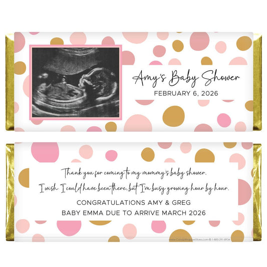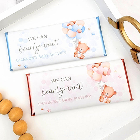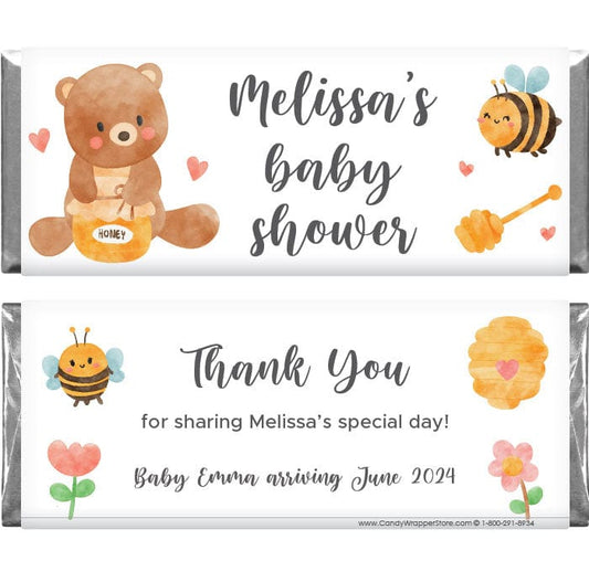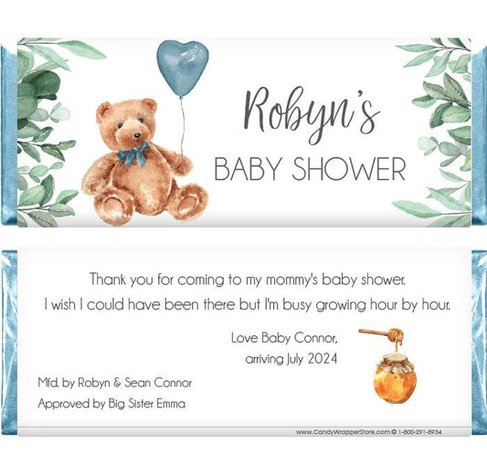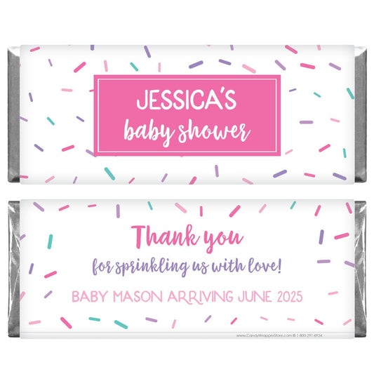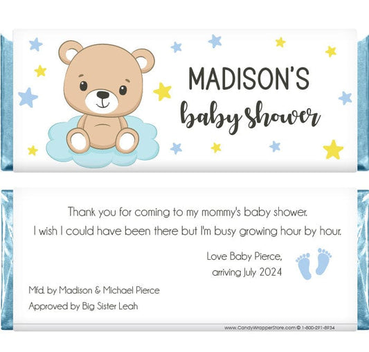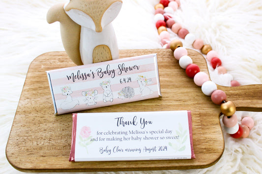 Personalized baby shower Hershey's chocolate candy bar wrappers. Custom party favors can match your theme or colors of your baby shower. Hershey's candy bar wrappers make every baby shower that much sweeter! Unique party favors will leave a lasting impression on your guests and ensure they remember the special day you celebrated the welcoming of your new baby.