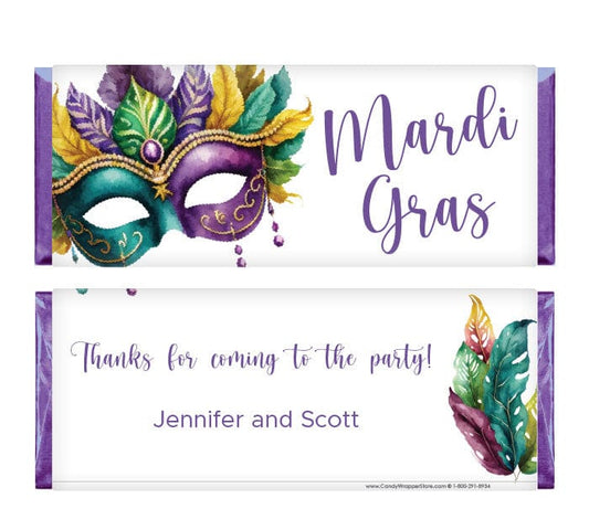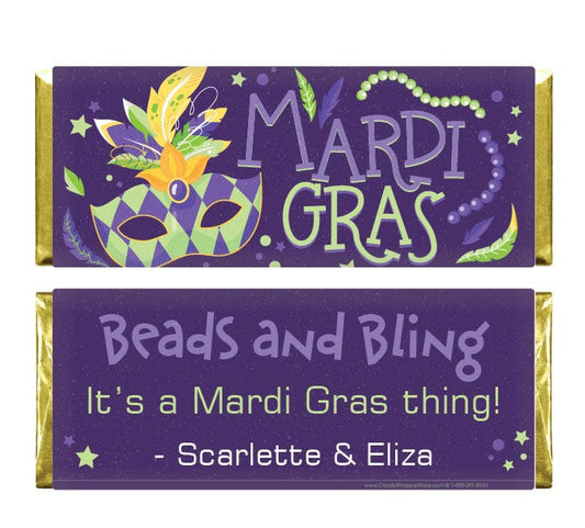 Beads and bling, it's a Mardi Gras thing!  Celebrate Carnival with fun personalized party favors including candy bar wrappers, water bottle labels and stickers for gift bags.