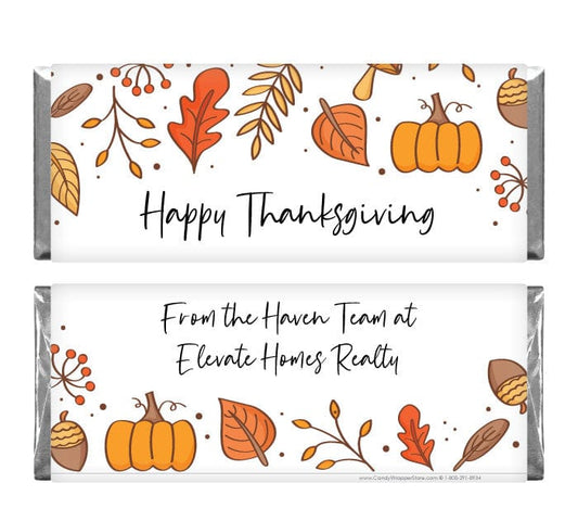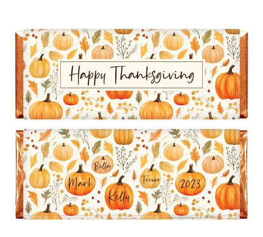 Thanksgiving candy bar wrappers. Personalized candy bar wrappers for your Thanksgiving dinner party or community event. Candy Wrapper Store also offers molded / engraved Belgian chocolate bars. Designs include turkeys, pumpkins, cornucopias, fall themes and more! Custom wrapped candy bars make great place settings for your tables.