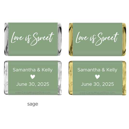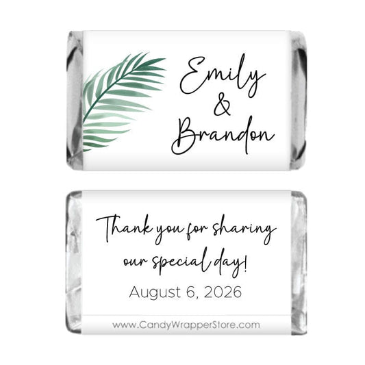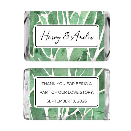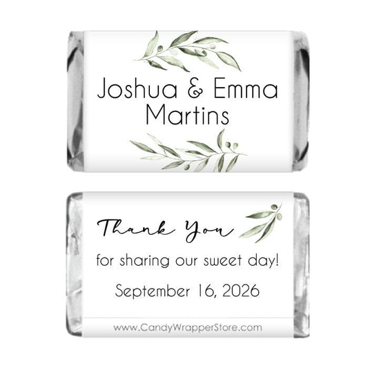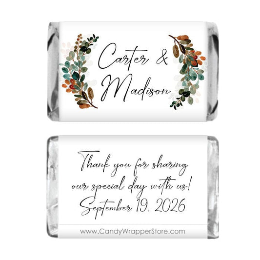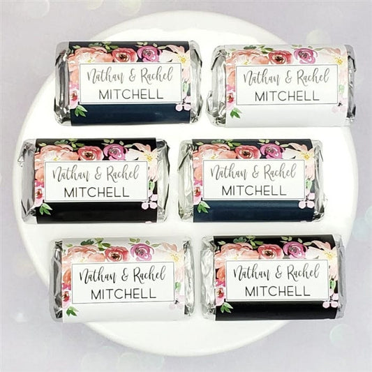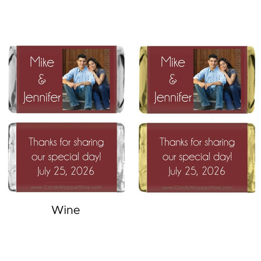 Personalized Hershey's miniature milk chocolate assorted candy bars and wrappers. Custom candy bar wrappers for your wedding reception. Add these high quality, sweet creations to your party or wedding reception. Our candy bars and wrappers look great as table decorations or displayed on your candy buffet table. Candy Wrapper Store can match your wedding theme or colors to make them uniquely you and compliment any wedding. You can chose to have us completely assemble your wedding candy bars and wrappers or just order the wrappers and assemble them yourselves.