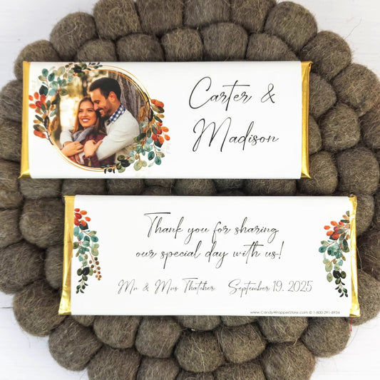 Personalized Hershey's milk chocolate candy bars wrappers. Custom candy bars for your wedding reception. Add these high quality, sweet creations to your party or wedding event. Candy Wrapper Store can match your wedding theme and colors. You can chose to have us completely assemble your wedding wrappers and candy bars, or just order the wrappers and foil and assemble them yourselves.