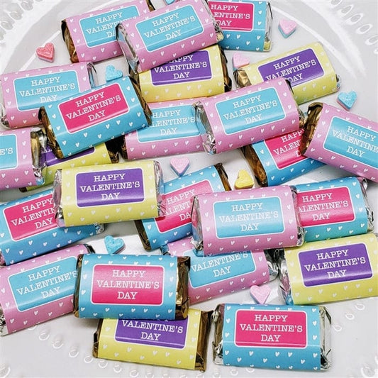 Valentines Day themed Hershey's miniature chocolate candy bar wrappers. The perfect treat to hand out to friends or classmates in school or for customers to take from your candy dish at your office. Custom wrapped candy bars are a sweet treat on Valentines Day. These miniature chocolate candy bars with custom wrappers also look great when used at your Valentines Day party celebration when sprinkled on tables for everyone to enjoy.